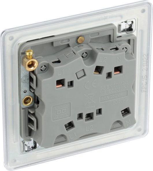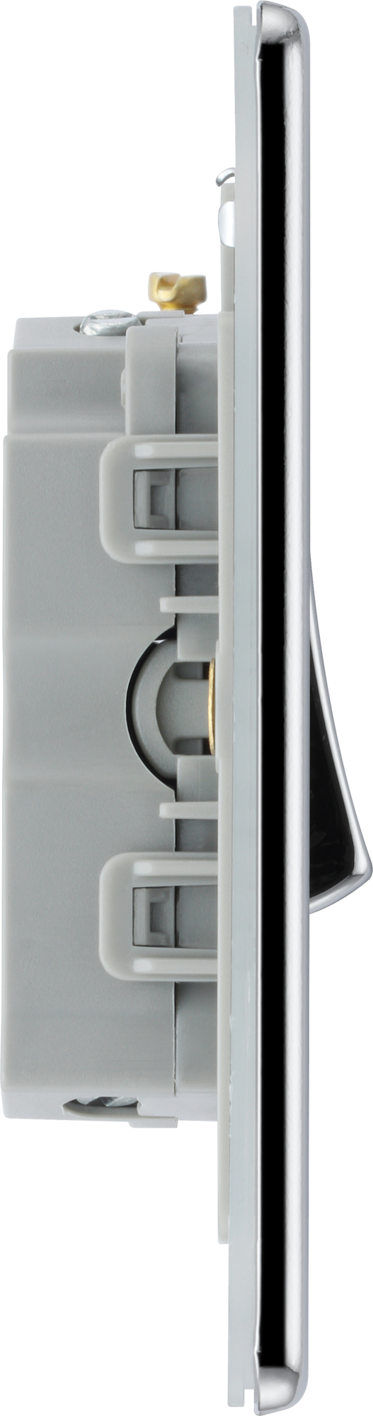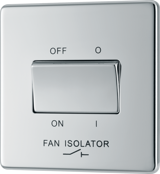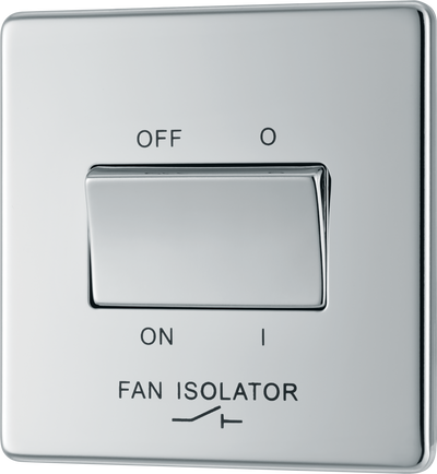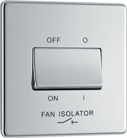 The BG Electrical Nexus Screwless Flat-Plate FPC15 is a polished chrome 3-pole 10A fan isolator switch, manufactured by British General Electrical.