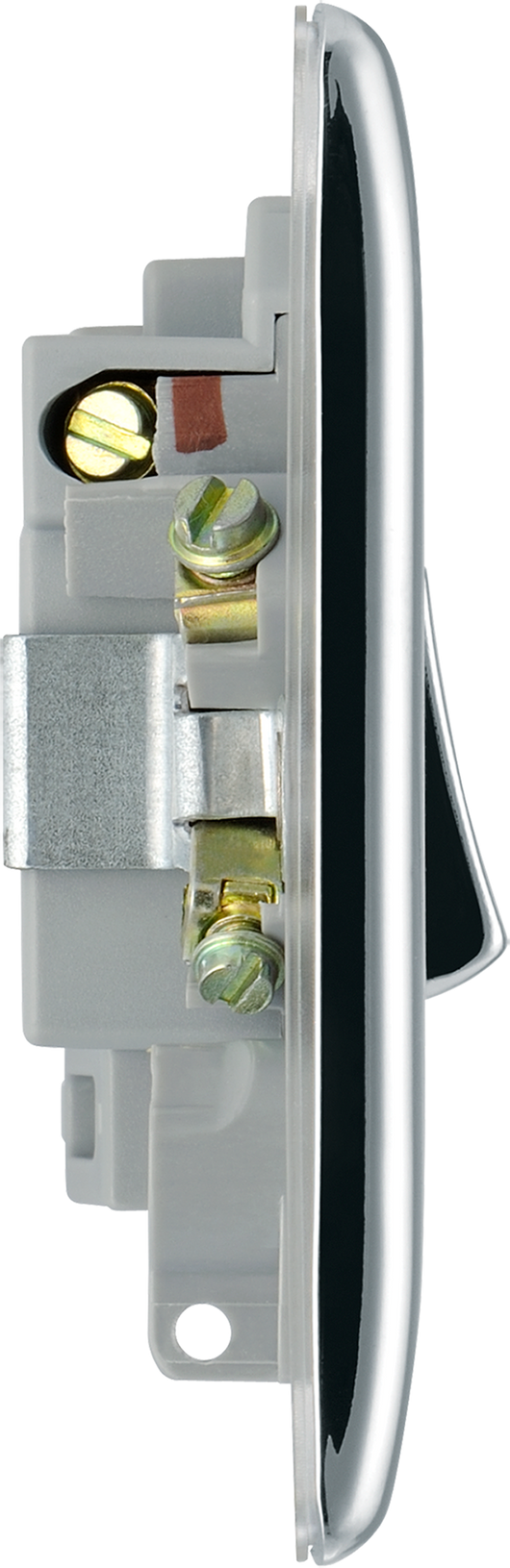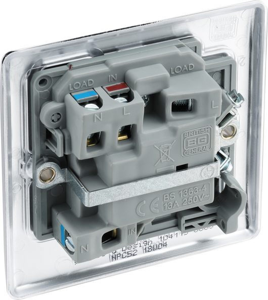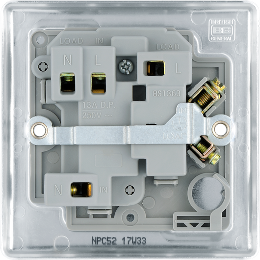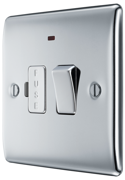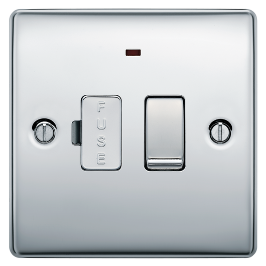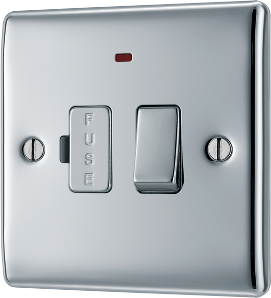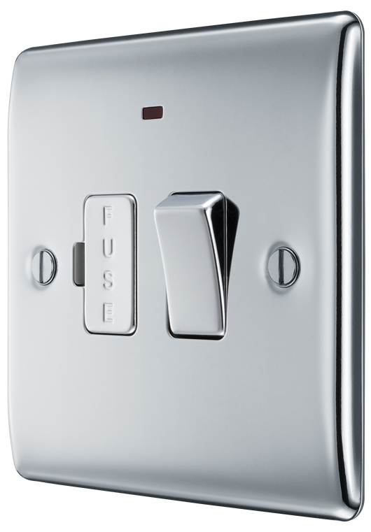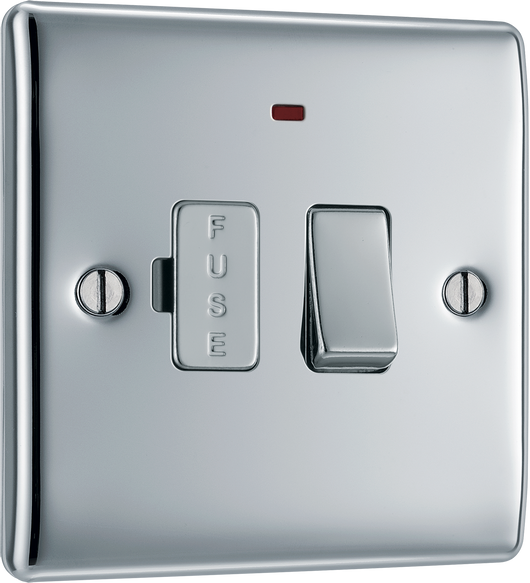 The BG Electrical Nexus Metal NPC52 is a polished chrome switched 13A fused connection unit with a flush neon indicator, manufactured by British General Electrical.
