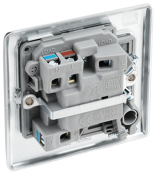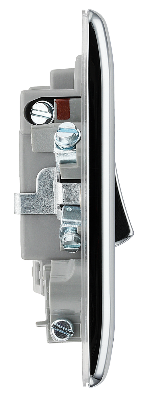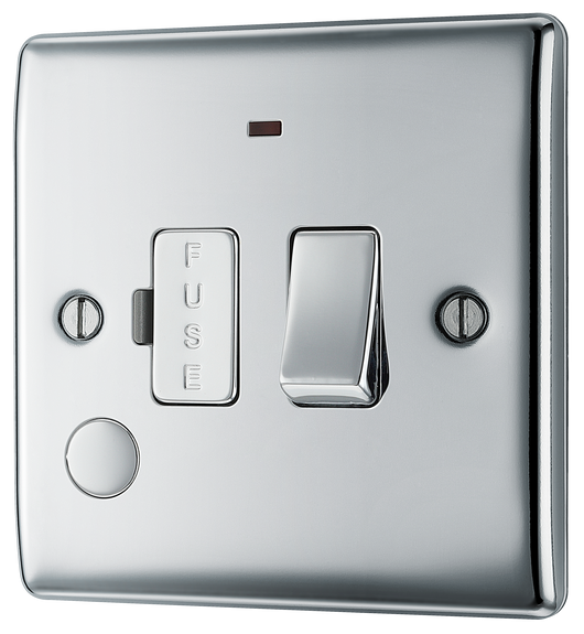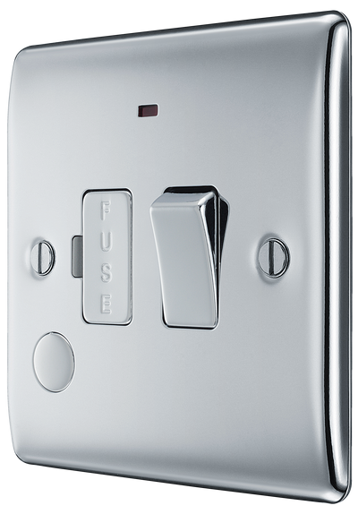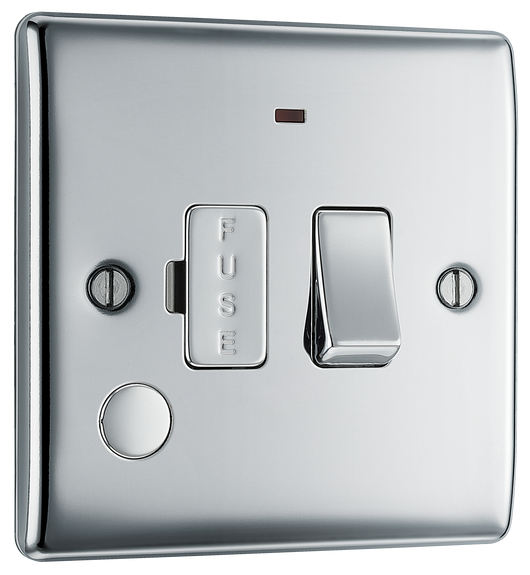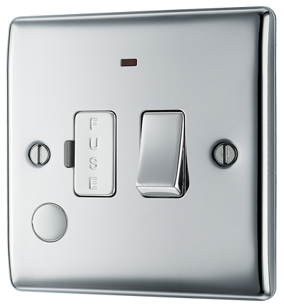 The BG Electrical Nexus Metal NPC53 is a polished chrome switched 13A fused connection unit with a flush neon indicator and flex cable entry, manufactured by British General Electrical.