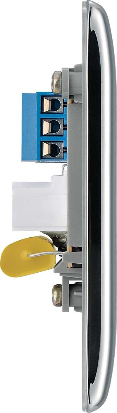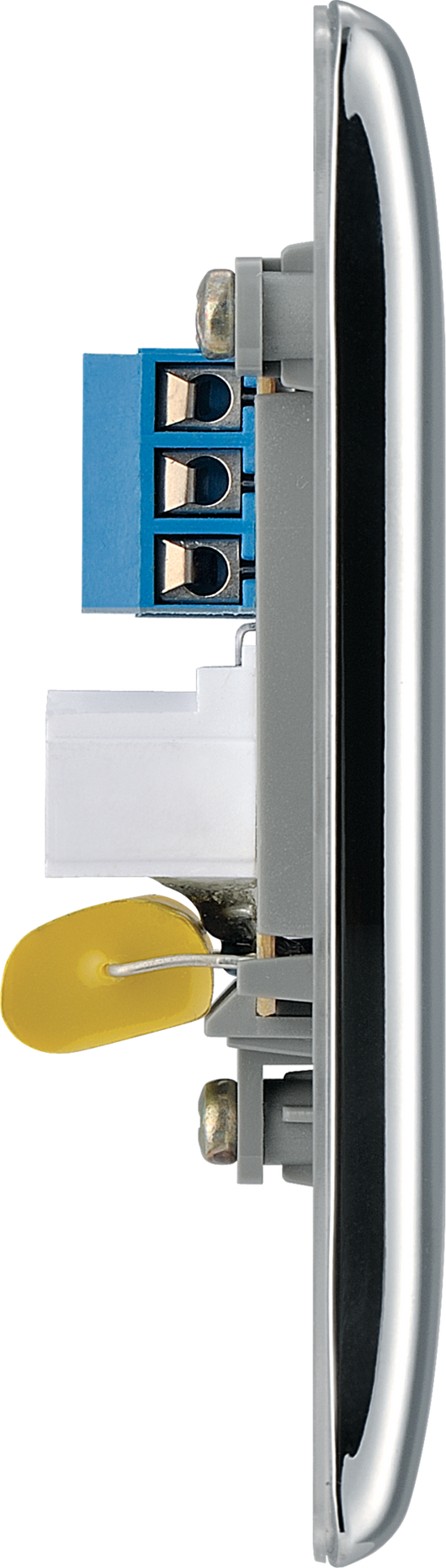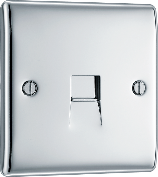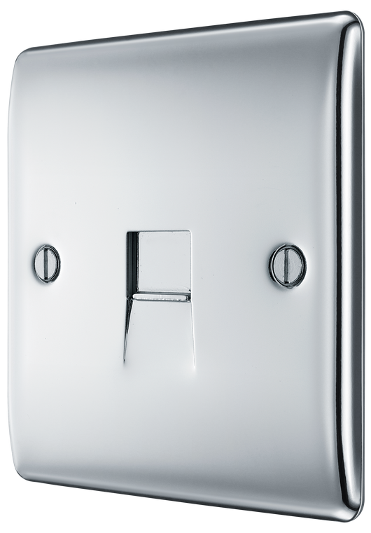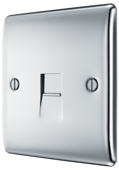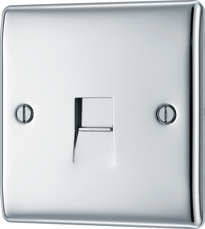The BG Electrical Nexus Metal NPCBTM1 is a polished chrome single (1 gang) master telephone socket, manufactured by British General Electrical.