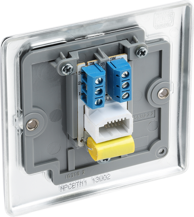 The NPCBTM1 is a single master telephone socket that is suitable for both the home and the office. It has a slim profile, softly rounded corners and a polished chrome finish that will suit a huge range of interior decor. The lightly lacquered surface reduces the impression of fingerprints and there is no visible plastic surrounding the socket, keeping it looking cleaner and tidier for longer.